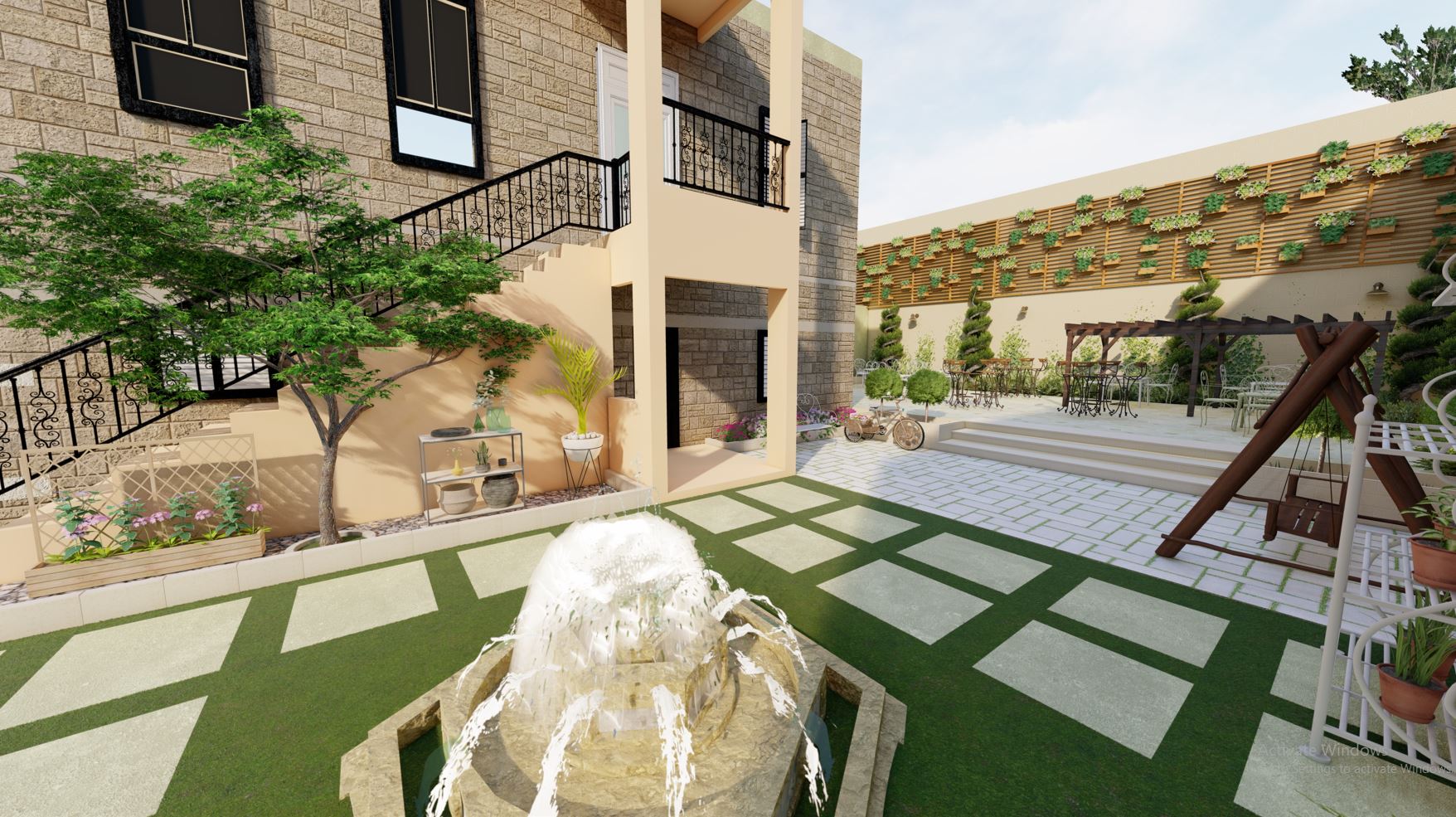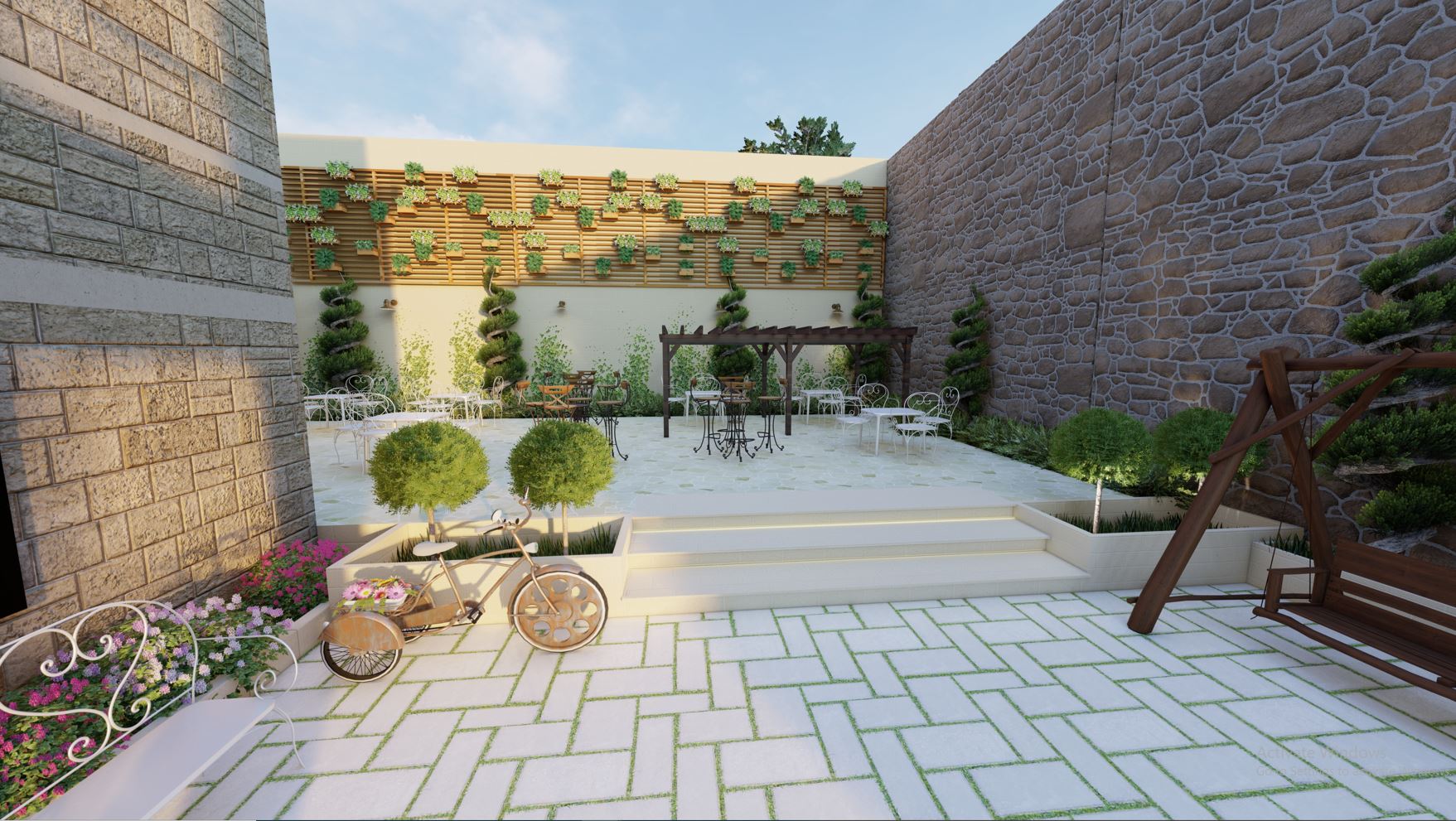 The Garden is an outdoor extension of Palais De La Perle Guesthouse. Intended to serve as an outdoor space and an extension of the restaurant, the garden is the link between the indoor and the outdoor. The interior being purely designed to revive the traditional Lebanese and classic French architecture; the landscape is designed in a balanced manner to fit with the concept of classic design combined with some modern outdoor elements.